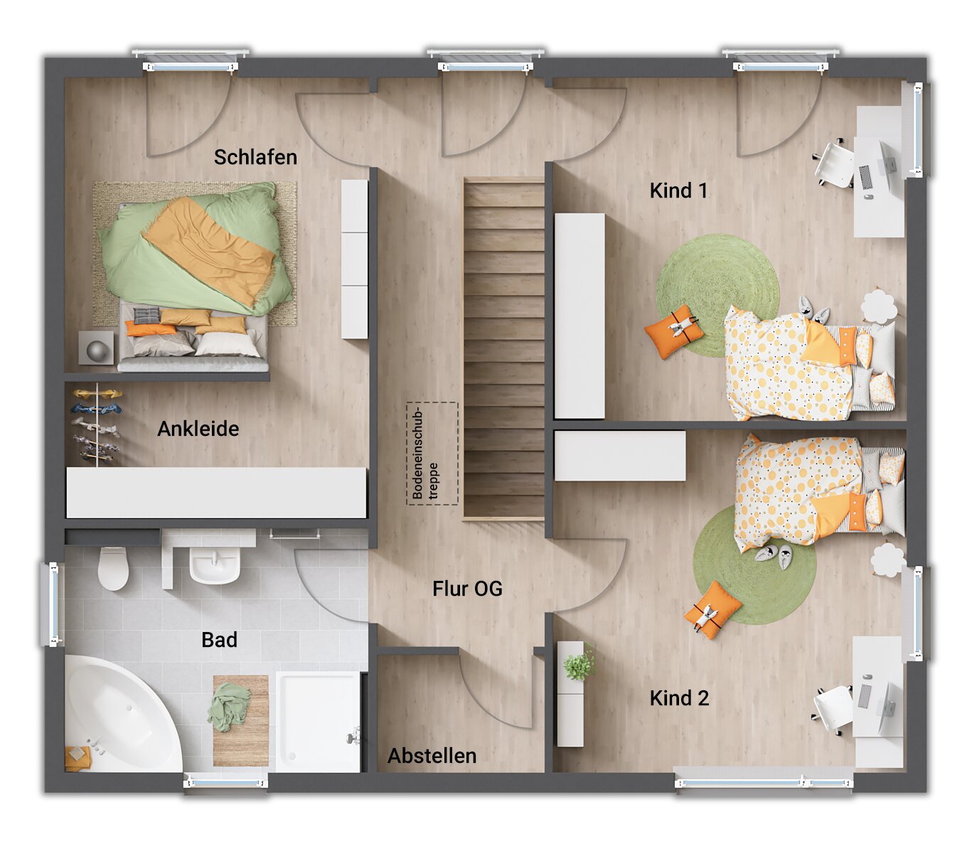- Eltern- und Kinderbereich im Obergeschoss getrennt durch den Flur